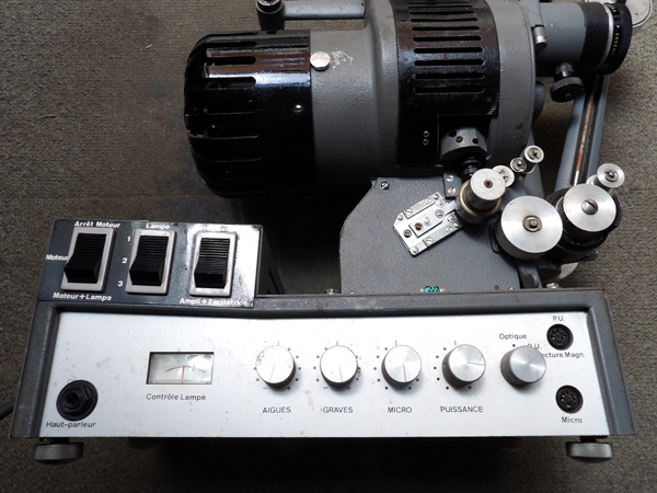 COMMENTAIRE : Dernière génération de la série MB 220V, cet appareil est équipé d'une lampe halogène moderne 24V 250W, ainsi que d'un amplificateur intégré avec sortie haut-parleur sur jack. Le chargement du film est manuel et la projection s'effectue à 24 images/seconde. L'appareil a été testé pendant plusieurs heures et fonctionne parfaitement. On note quelques traces d'usage et de légères oxydations par endroits. L'appareil est vendu avec une bobine réceptrice.