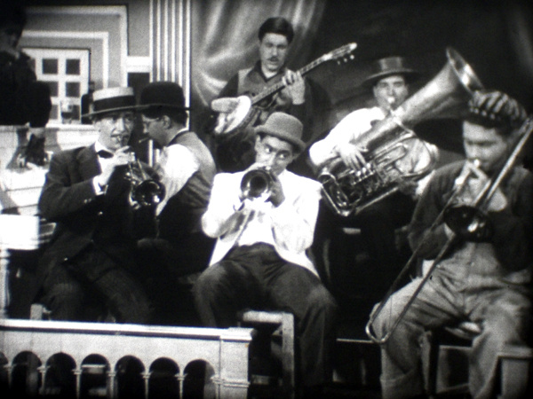 Avant-programme musical, dans lequel on voit les artistes de Jazz et de Variété jouer sur la scène décorée d'un cabaret.